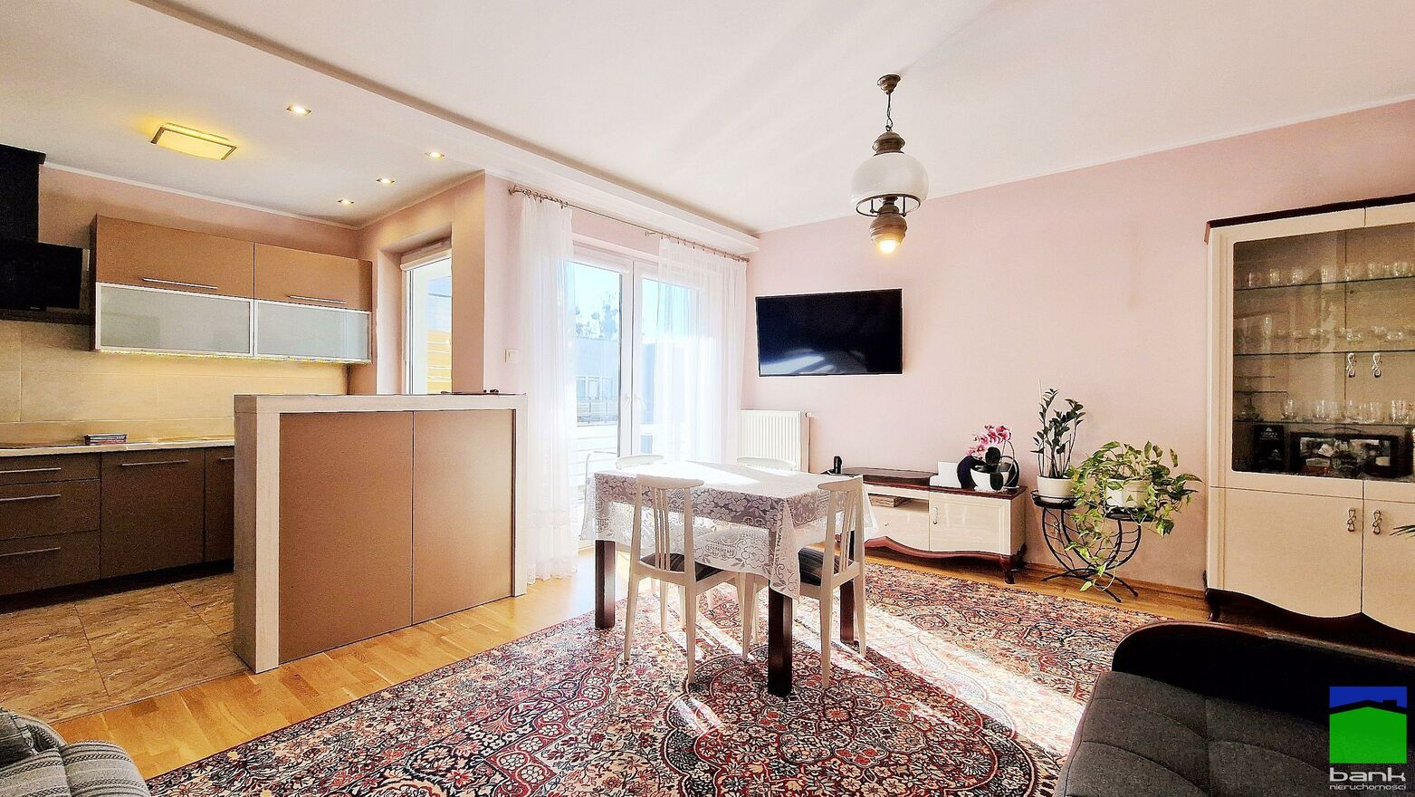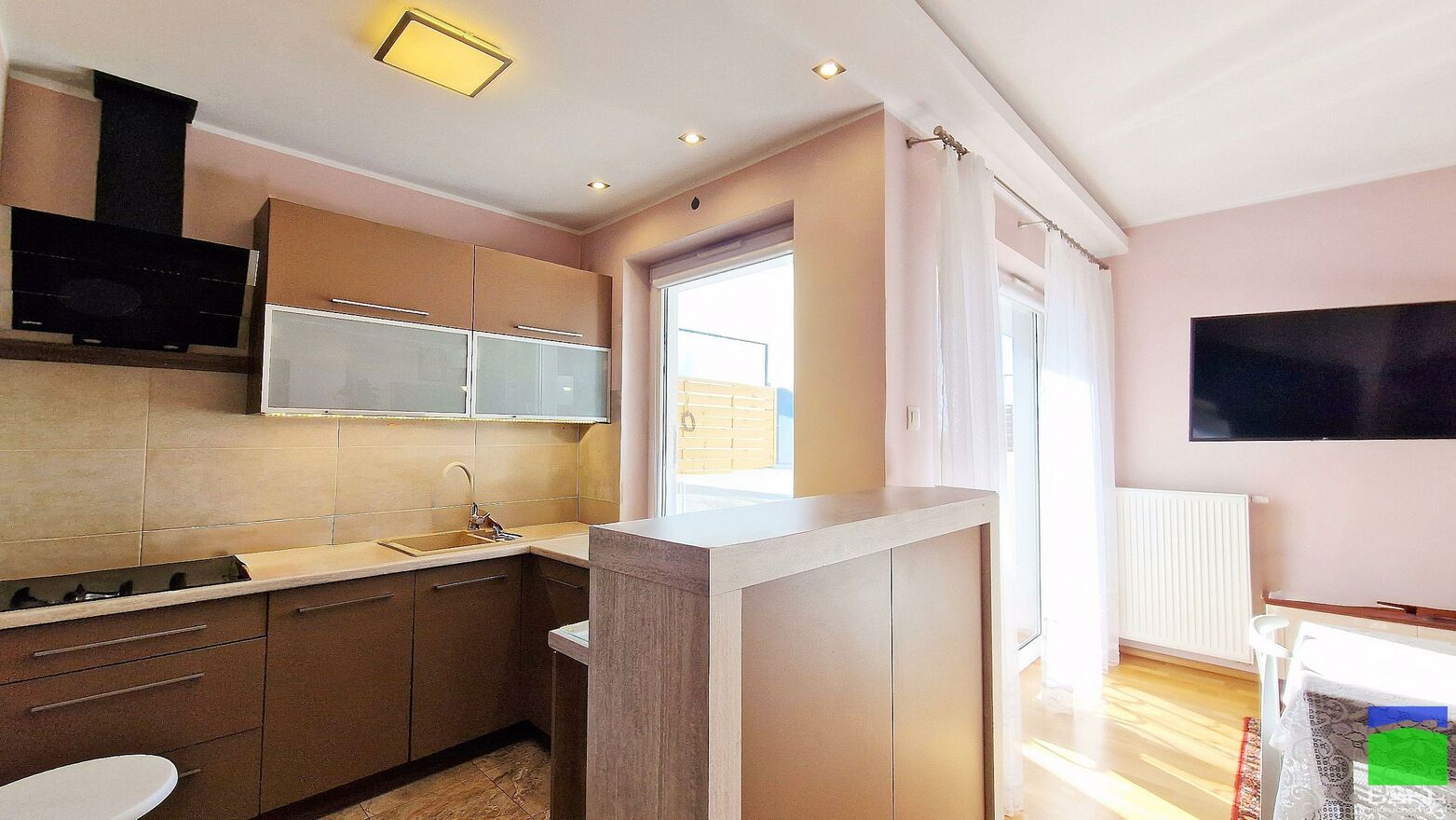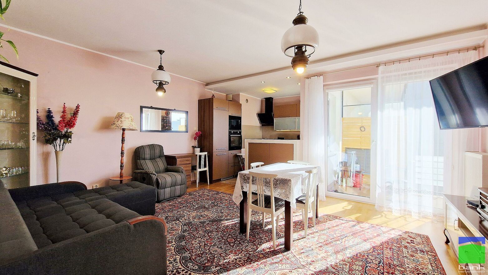 - przestronnego salonu z aneksem kuchennym oraz wyjściem