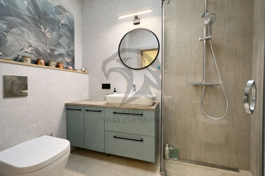 Łazienka, przestronna, wyposażona w kabinę prysznicową. Na
