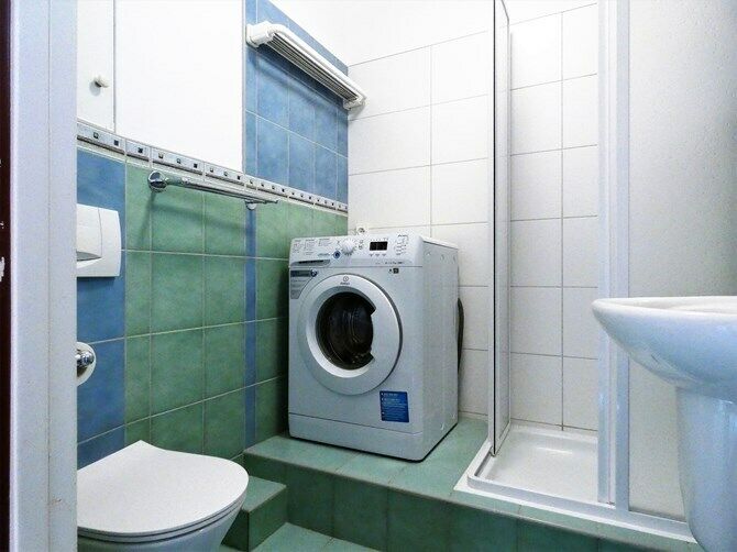Łazienka: lustro, umywalka, pralka, kabina prysznicowa.