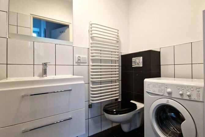Łazienka z WC: wanna, umywalka, lustro, szafka, pralka.