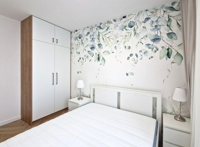 Sypialnia: łóżko z materacem, dwie lampy nocne, szafa, dwie małe