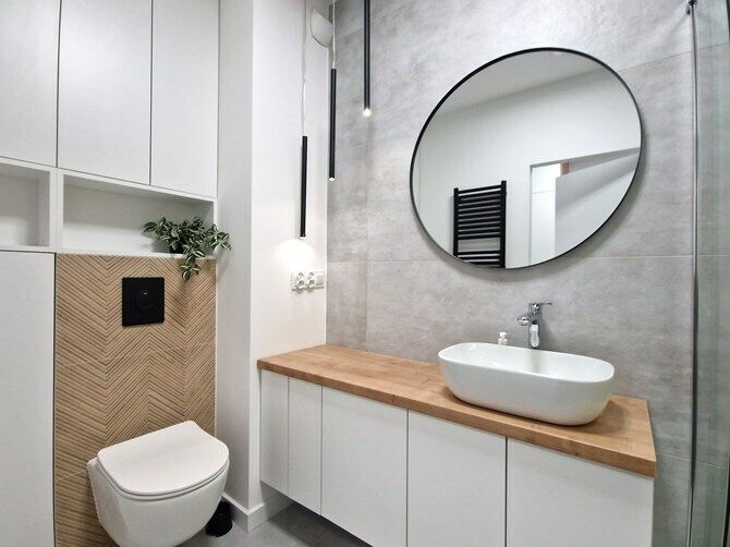 Łazienka (razem z WC): pralka, kabina, umywalka, lustro, szafki.