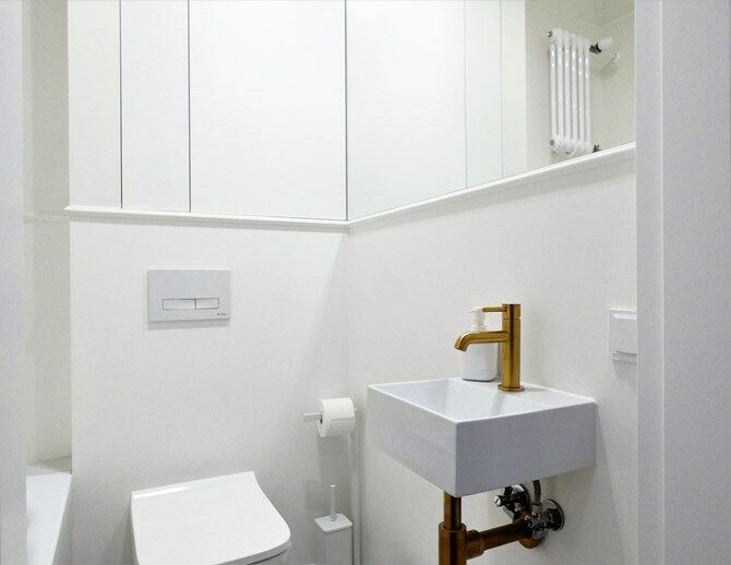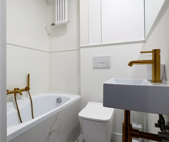 Łazienka: wanna, umywalka, WC, lustro z półką.