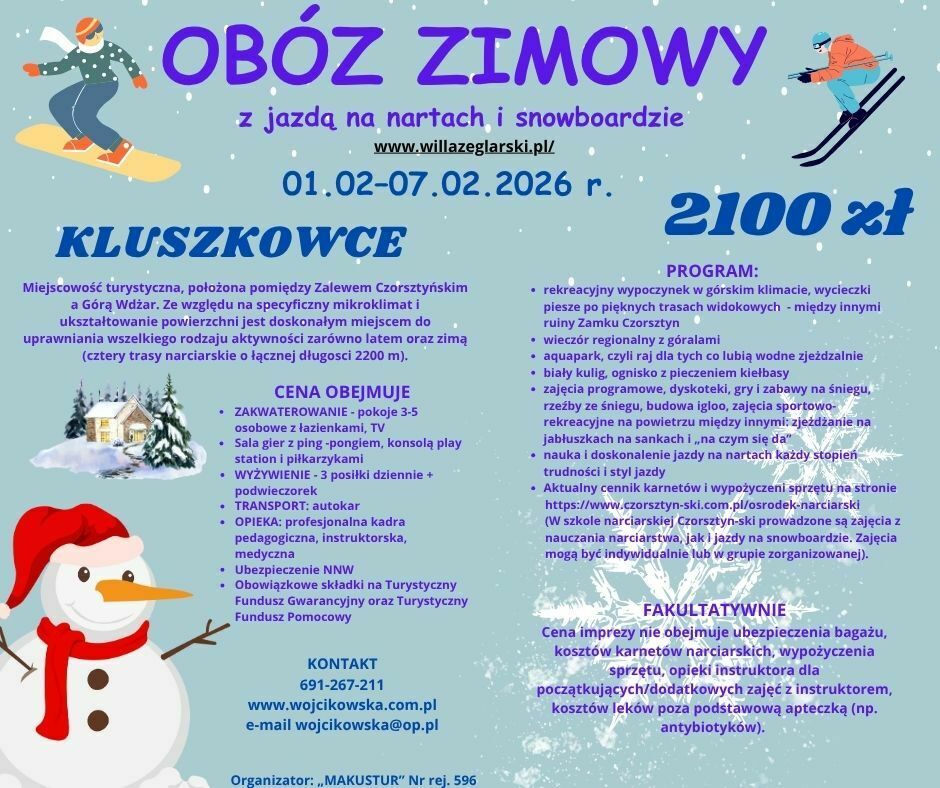 Kluszkowce - 01.02. - 07.02.2026Zapraszamy na obóz zimowy w miejscowości Kluszkowce. Położona pomiędzy Zalewem Czorsztyńskim a Górą Wdżar, ze względu mikroklimat i ukształtowanie powierzchni jest doskonałym miejscem do uprawniania wszelkiego rodzaju aktywności zimą (cztery trasy narciarskie o łącznej długosci 2200 m).