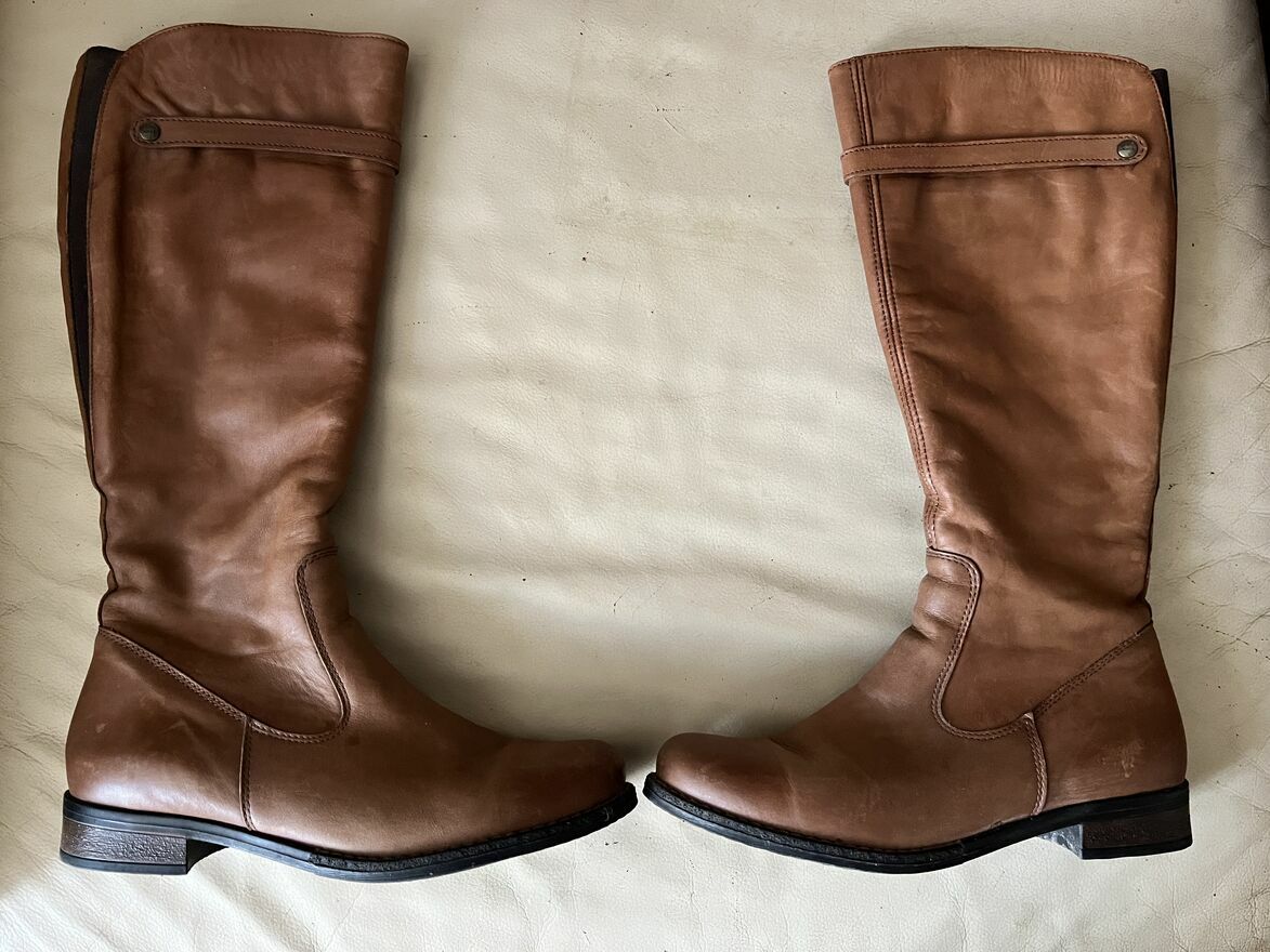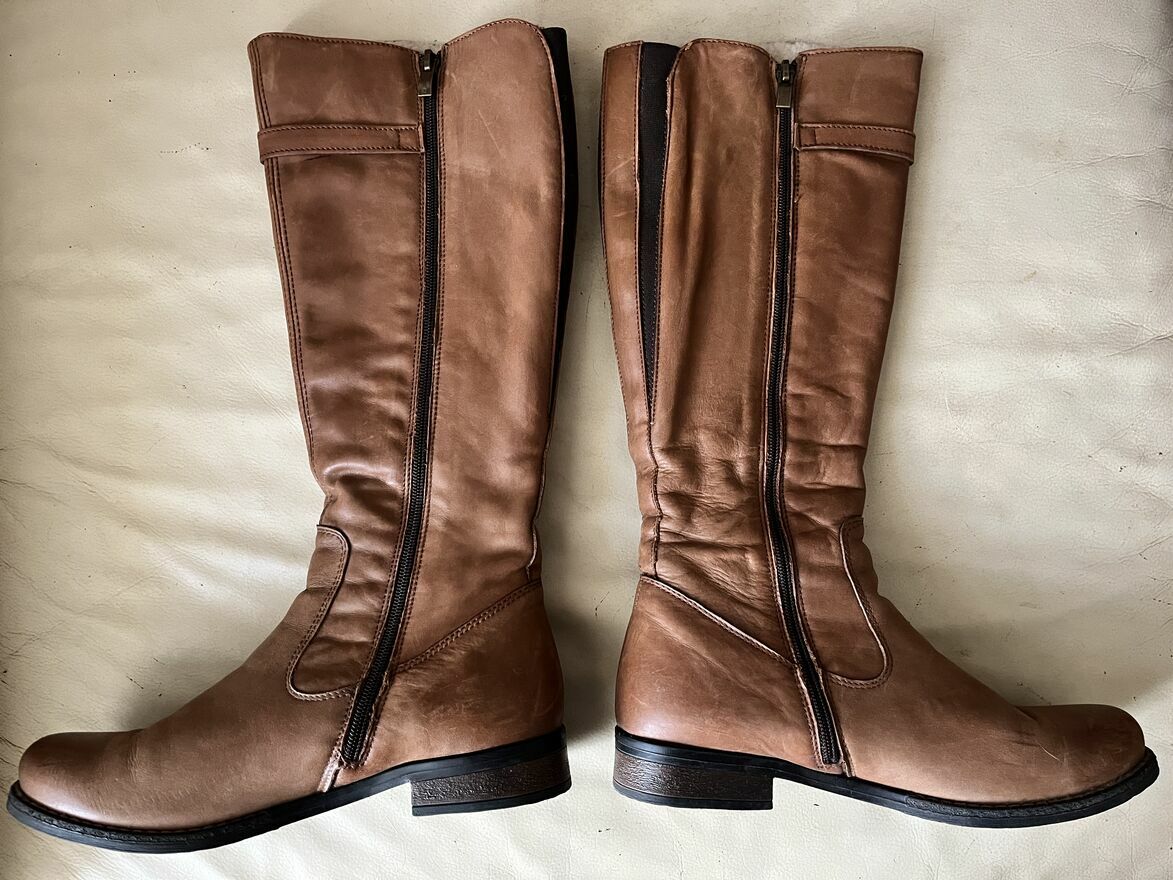 Skórzane kozaki typu oficerki w kolorze beżowo-brązowym pasujące do wszystkiego i doskonałe uzupełnienie codziennego stroju. Krótko używane, ale w dobrym stanie widocznym na zdjęciach. Ze skóry w środku ocieplane jasnym futerkiem są idealne na chłodniejsze zimowe dni. Zapinane na długi ekspres od wewnętrznej strony, który ułatwia zakładanie i zdejmowanie kozaków.POLECAM serdecznie i zachęcam do zakupu kozaków.