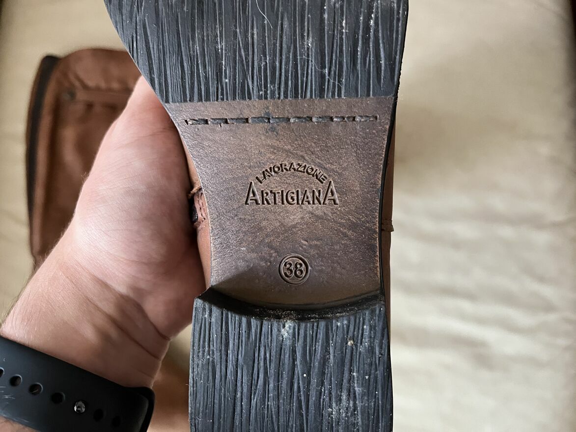 OKAZJA kozaki typu oficerki w kolorze beżowo - brązowym