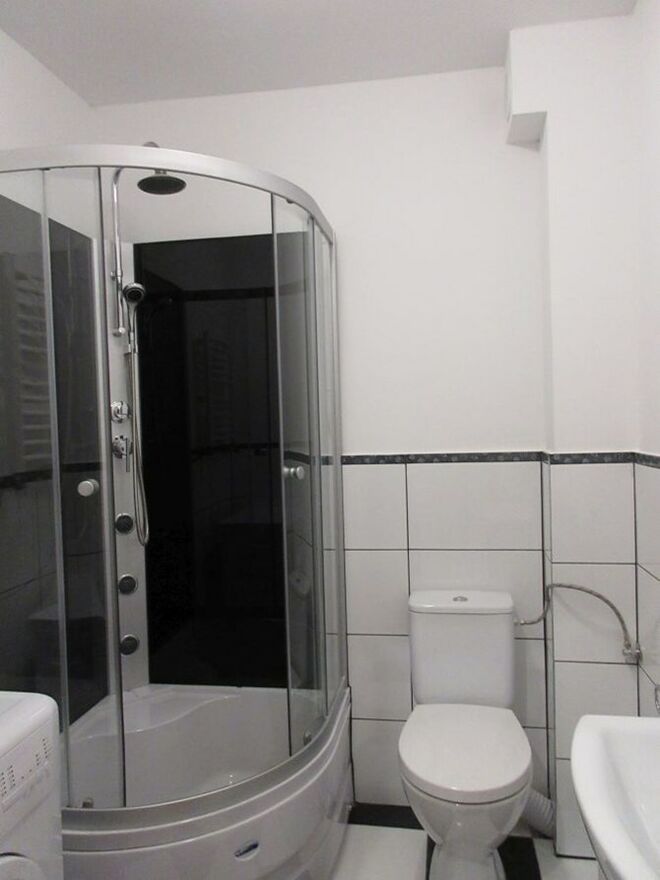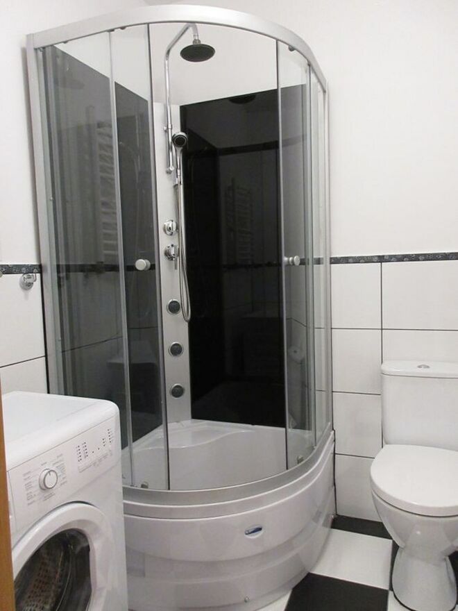 Łazienka z WC: kabina prysznicowa, umywalka, pralka.