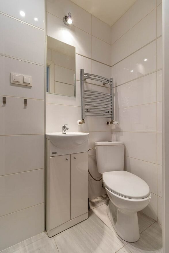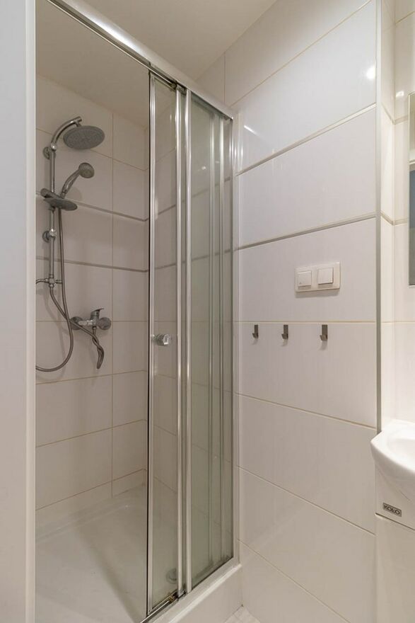 Łazienka: kabina prysznicowa, umywalka, WC.