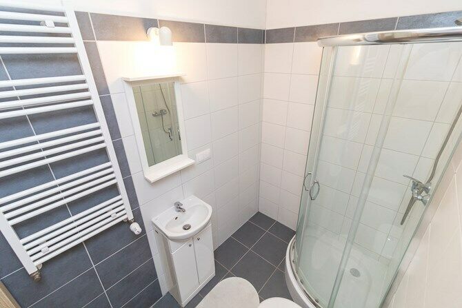 Łazienka: lustro z półką, kabina prysznicowa, pralka, WC.