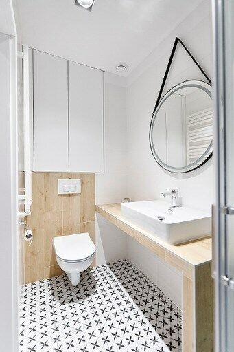 Łazienka: kabina prysznicowa, WC, umywalka, szafka, lustro.