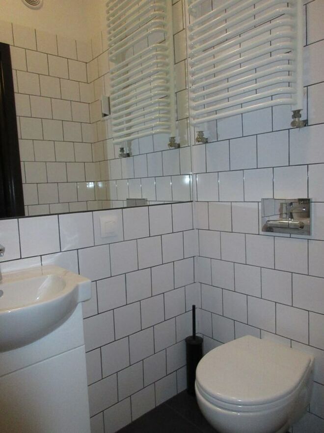 Łazienka: kabina prysznicowa, WC, szafka na kosmetyki, umywalka,