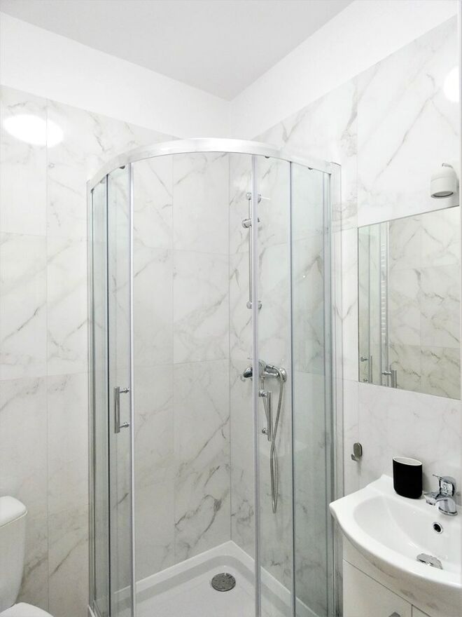 Łazienka: kabina prysznicowa, WC, pralka, lustro z szafką.