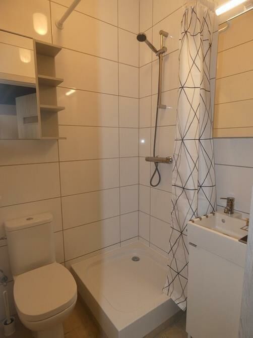 Łazienka: prysznic, toaleta, umywalka.