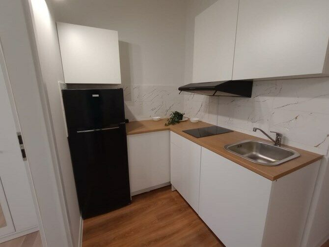 Wspólna kuchnia zawiera szafki, lodówkę, płytę elektryczną i