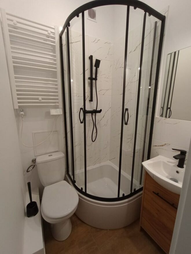 Łazienka: kabina prysznicowa, WC, umywalka.
