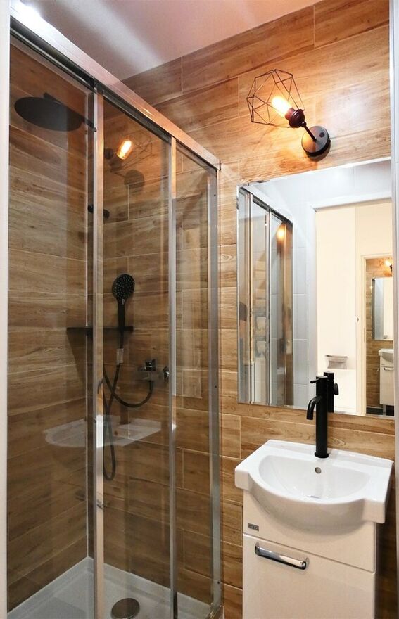 Łazienka z WC: kabina prysznicowa, lustro, umywalka.