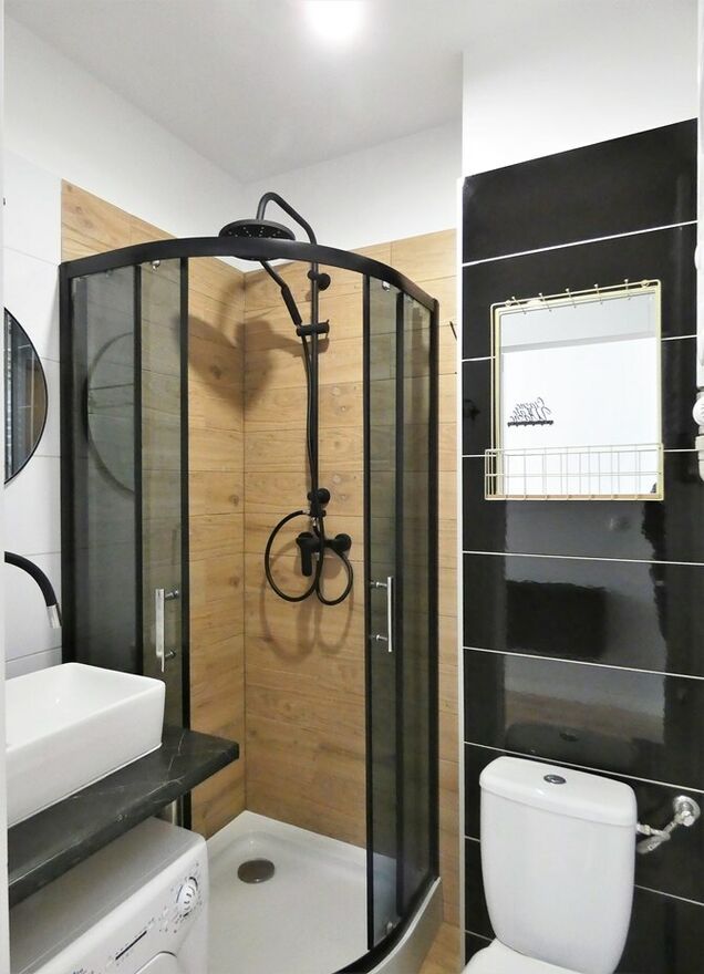 Łazienka z WC: kabina prysznicowa, lustro z umywalką, pralka, WC.