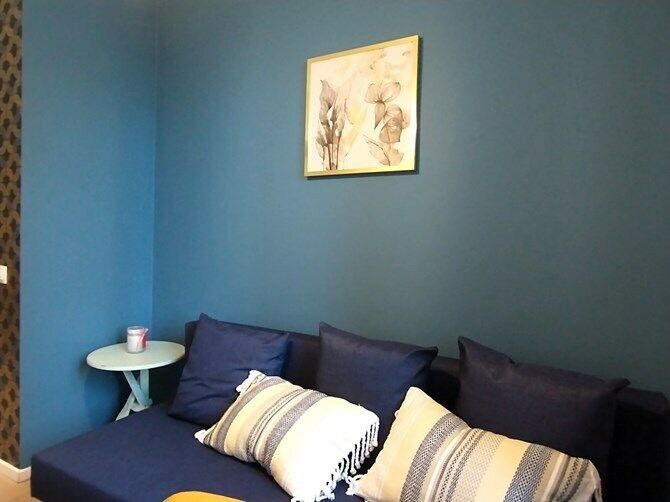 Pokój z aneksem: szafki wiszące i stojące, rozkładana kanapa,