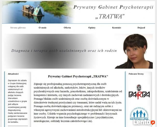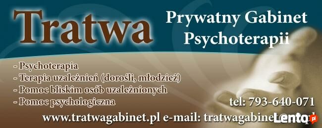 Gabinet Psychoterapii TRATWA. Terapia uzależnień, pomoc bliskim osób uzależnionych, pomoc psychologiczna. Zapraszam. Odpłatne sesje psychoterapii indywidualnej na poziomie podstawowym i pogłębionym, terapia nawrotów choroby, poradnictwo. Gabinet: Łódź Teofilów ul.Duńska 21, II piętro[winda dla os. niepełnosprawnych], Wizyty po uzgodnieniu telefonicznym lub za pomocą e-kalndarza dostępnego na stronie. Zapraszamy.www.tratwagabinet.pl