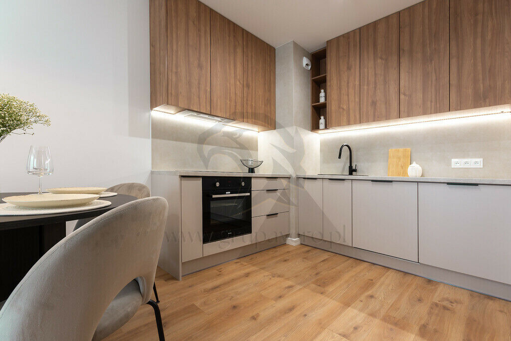 Kuchnia w zabudowie prezentuje się jakby miała umowę z Netflixem na