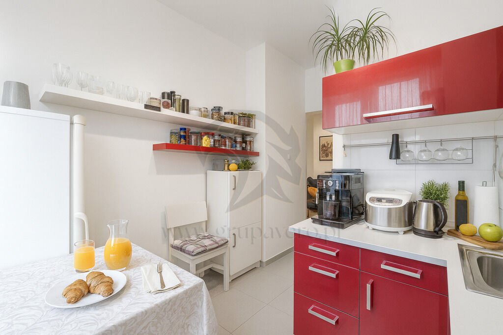 Wyposażenie obejmuje: szafki stojące i wiszące, kuchenkę