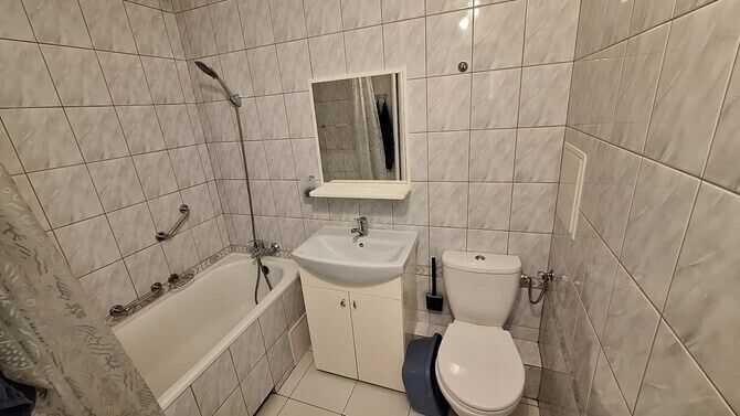 Łazienka: wanna, toaleta, umywalka.