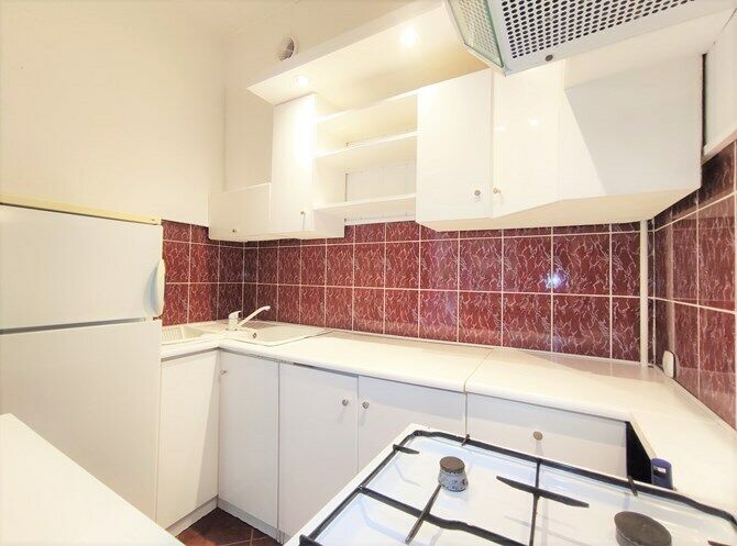 W kuchni: szafki wiszące i stojące, lodówko-zamrażarka,