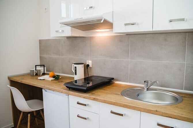 Aneks kuchenny: szafki, lodówka, dwupalnikowa płyta indukcyjna,