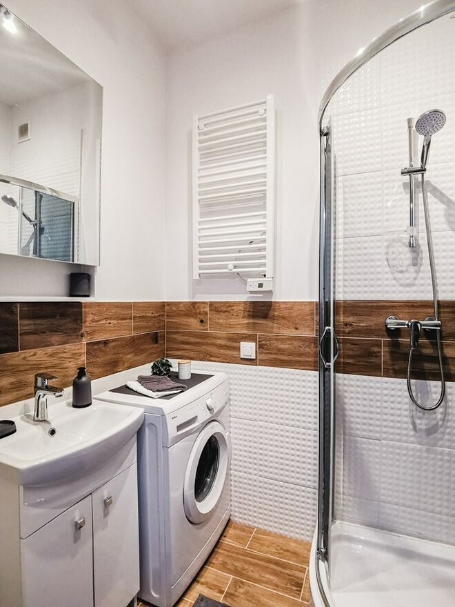Łazienka: kabina prysznicowa, pralka, umywalka z szafką, lustro.