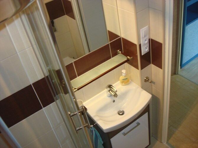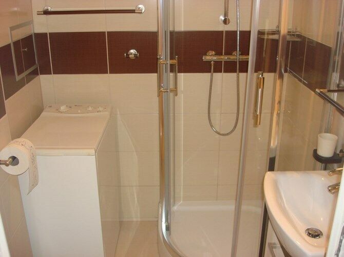 Łazienka: kabina prysznicowa, umywalka z szafką, pralka, WC.