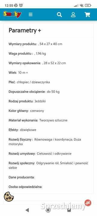 Witam, na sprzedaż czerwony jeździk Smoby z klaksonem. To idealna zabawka dla małych dzieci. Solidna konstrukcja, wygodne siedzenie i kierownica sprawią, że każda przejażdżka będzie przyjemnością. Dzięki klaksonowi maluch może się bawić i rozwijać swoje umiejętności motoryczne. Doskonały wybór dla małych miłośników pojazdów!Mało używany, nieudany prezent świąteczny. Na ostatnim zdjęciu parametry techniczne.