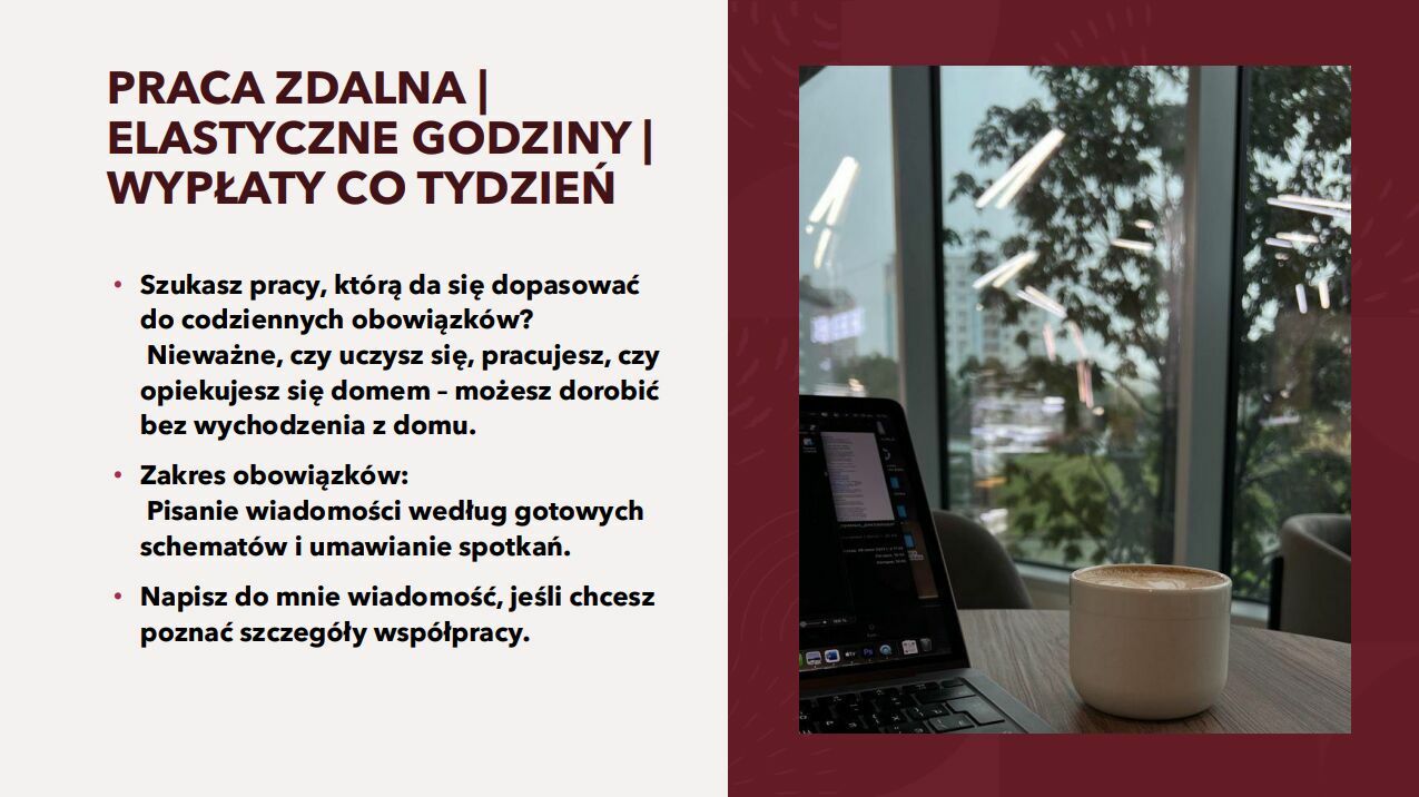 Praca zdalna – elastyczne godziny, tygodniówki!Szukasz pracy, którą łatwo pogodzić z nauką, dziećmi lub etatem?