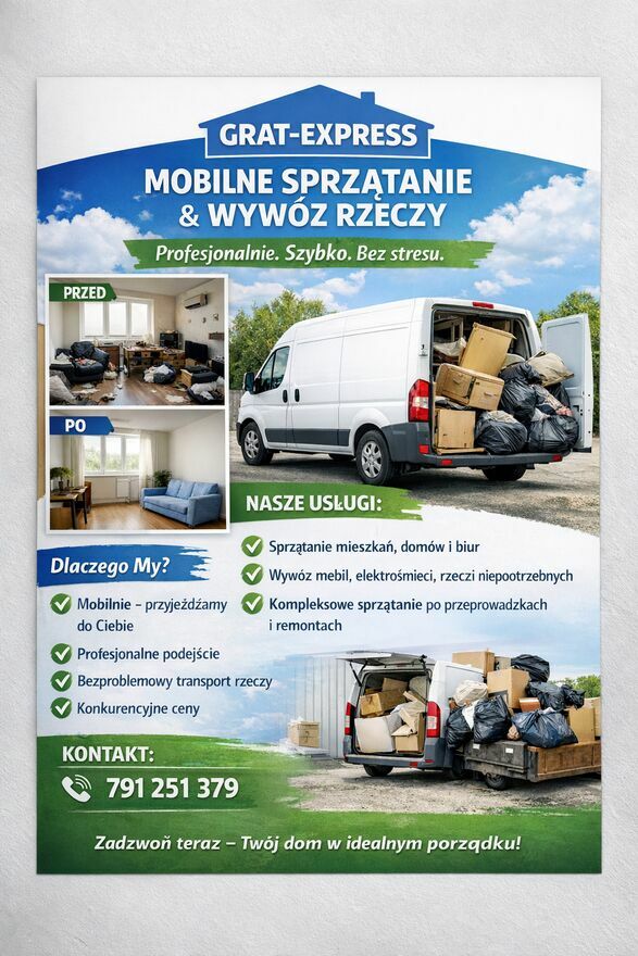 - Zakres usług:Mycie okien, Sprzątanie biur, Sprzątanie mieszkań i domów, Sprzątanie po remoncie, Wywóz gruzu, Wywóz śmieci