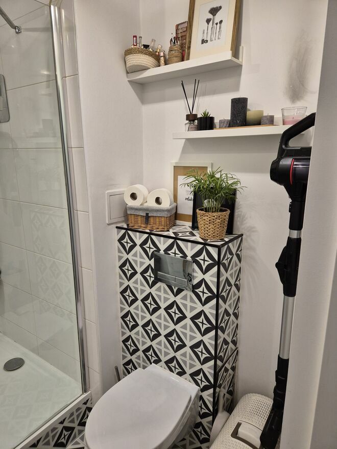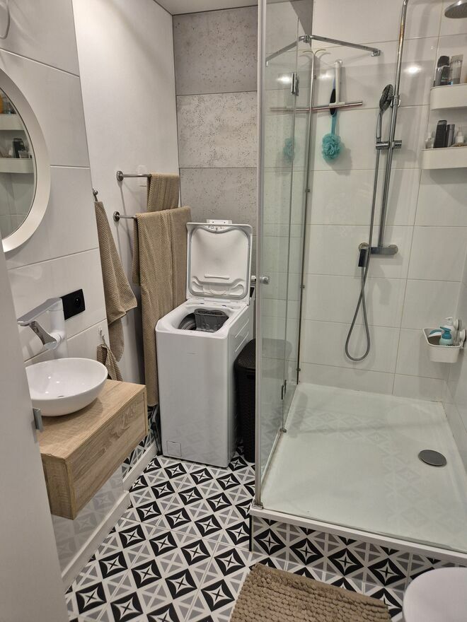 - łazienka powiększona (została przesunięta ściana) jest doskonale doświetlana, z dużym prysznicem (90x120) i pojemną szafką.