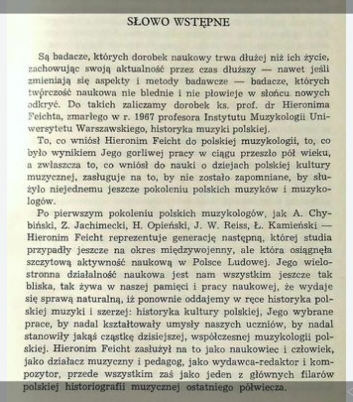 Opracowanie systematyzujące dorobek naukowy księdza Hieronima Feicht'a.Tom I, Studia nad Muzyką Polskiego Średniowiecza, wydany nakładem PWM w 1975 roku. Dodatkowo Tom pierwszy zawiera Słowo wstępne które jest zarazem rysem biograficznym księdza Hieronima Feicht'a, pióra Zofii Lissa.