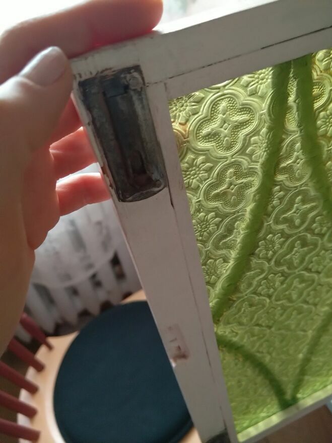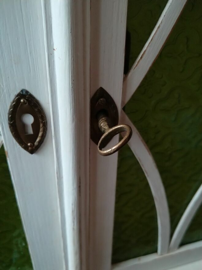 Szafka piękna, wisząca (rozstaw dziurek w haczykach do zawieszenie ma 28,5 cm). Zamykana, zamek jest sprawny. Przetarcia tzw. shabby chic. Szybka to zielone szkło w koniczynkę.Wymiar. Szer. 38,2 cm, wys. 39,5 cm, głębokość 23 cm.