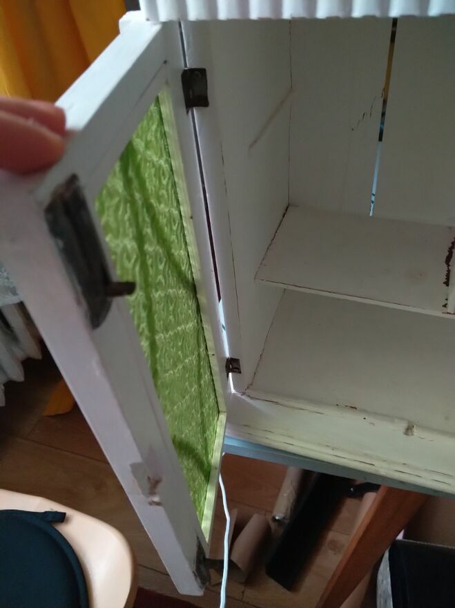 Szafeczka witrynka shabby chic z zielonymi szybkami