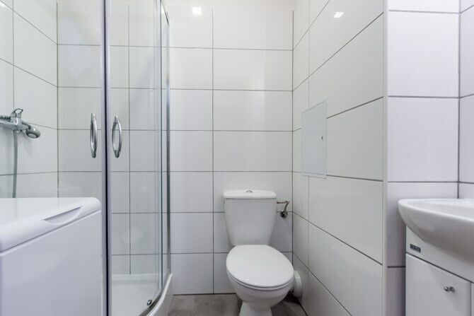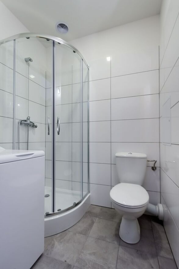 Łazienka: kabina prysznicowa, pralka, umywalka z szafką, lustro z