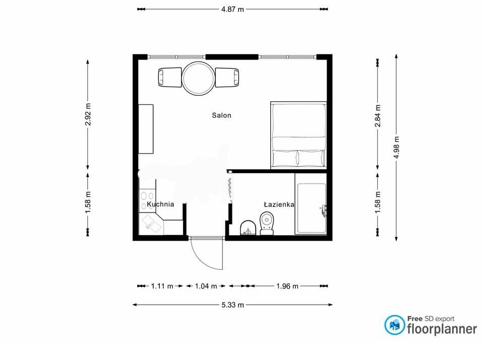 -Układ: pokój z aneksem kuchennym, łazienka z WC