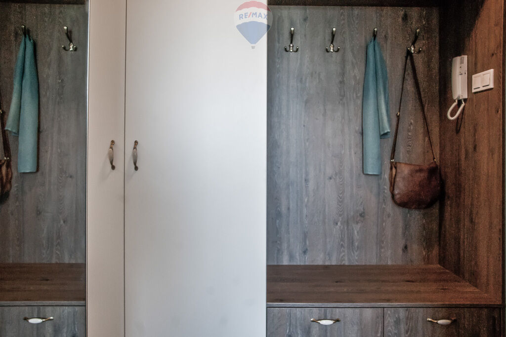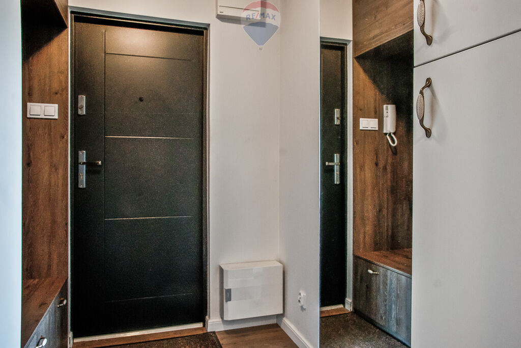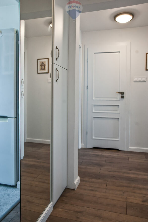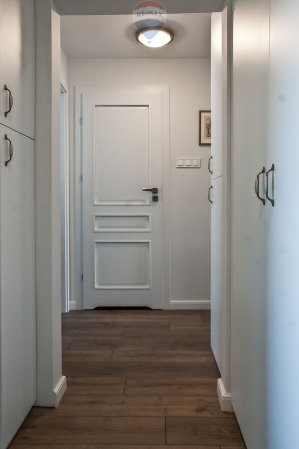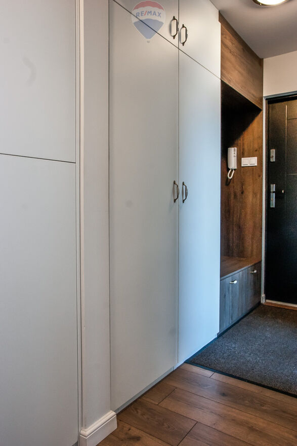 całego mieszkania jest aranżacja wygodnego przedpokoju z szafami w