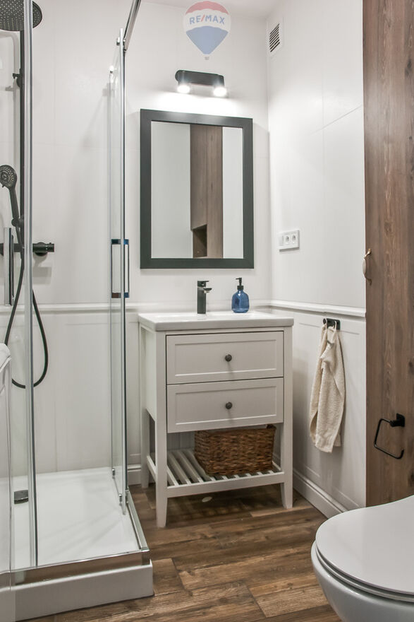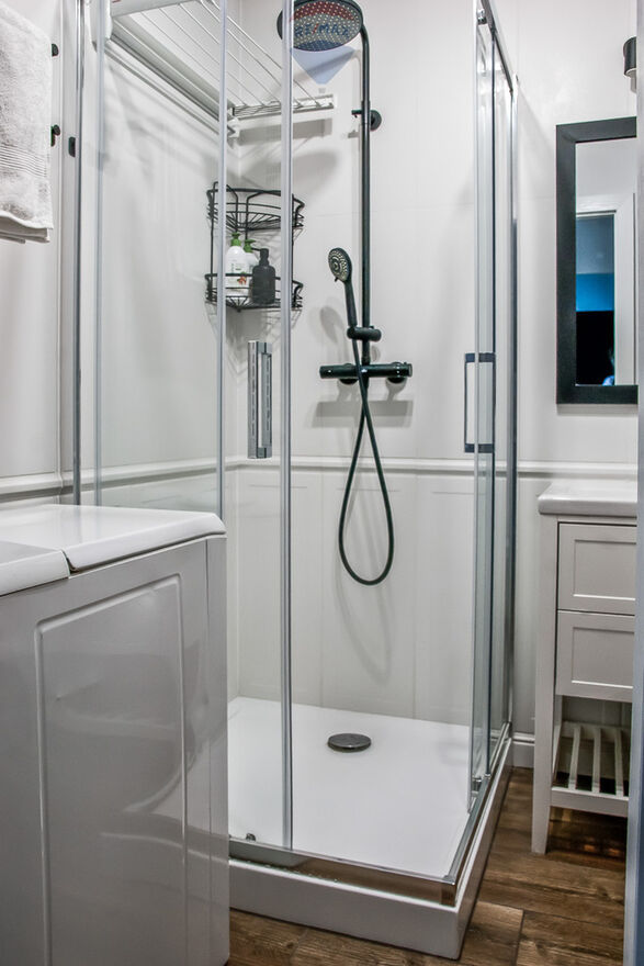 Łazienka po remoncie zyskała dużą kabinę prysznicową,