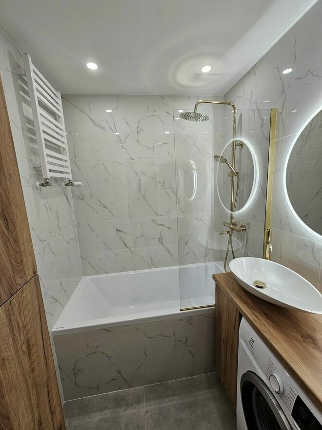 Łazienka / osobne wc: Pralka z nowoczesnym silnikiem interwałowym Elektrolux, szafka pod umywalke oraz nad geberitem wykonana przez stolarza. Deszczownica w zestawie ze słuchawka oraz bateria z wylewką (kran) - można brać prysznic jak w kabinie (zamontowany parawan aby uniknąć chlapania), albo posługując się wylewką przy baterii (kran) kąpiel w wannie. Nad umywalką lustro zapalane led. W osobnym wc nad geberitem szafka wykonana przez stolarza, dodatkowa umywalka i lustro.