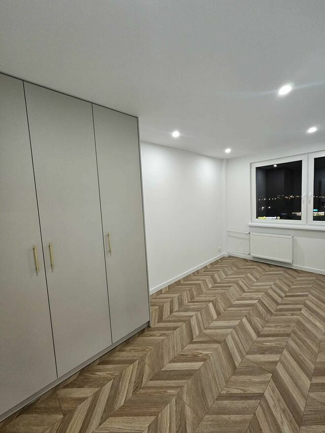 Sypialnia: Duża szafa na szerokość pokoju kaszmir, dwa zwisy przygotowane pod sypialniane łóżko oraz szafeczki nocne. Wypuszczone przewody tv/internet. Panele w nowoczesnym stylu "jodełka".