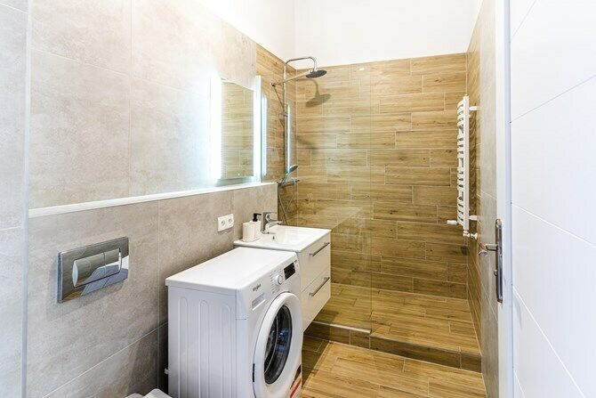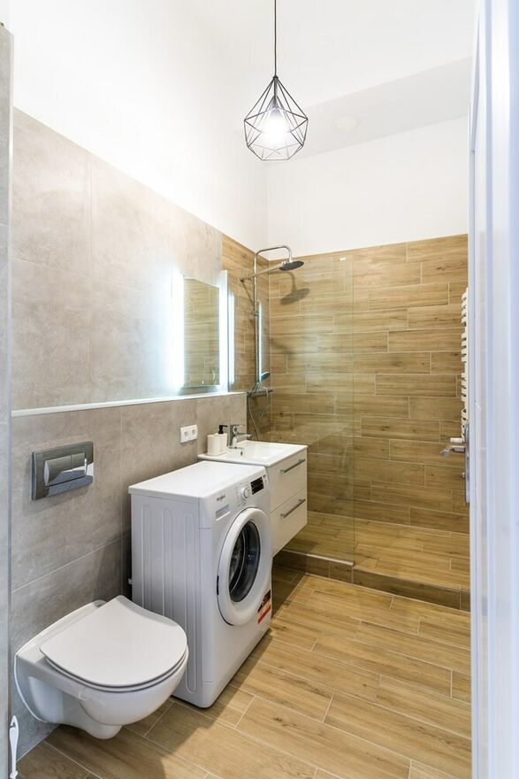 Łazienka razem z WC: kabina prysznicowa, pralka, lustro, umywalka,