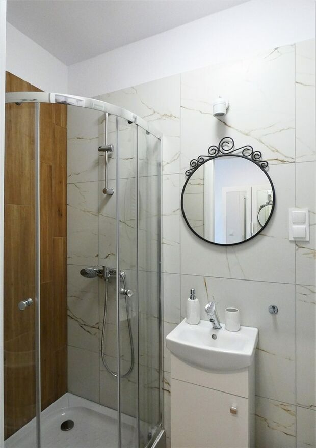 Łazienka razem z WC: kabina prysznicowa, lustro z umywalką.