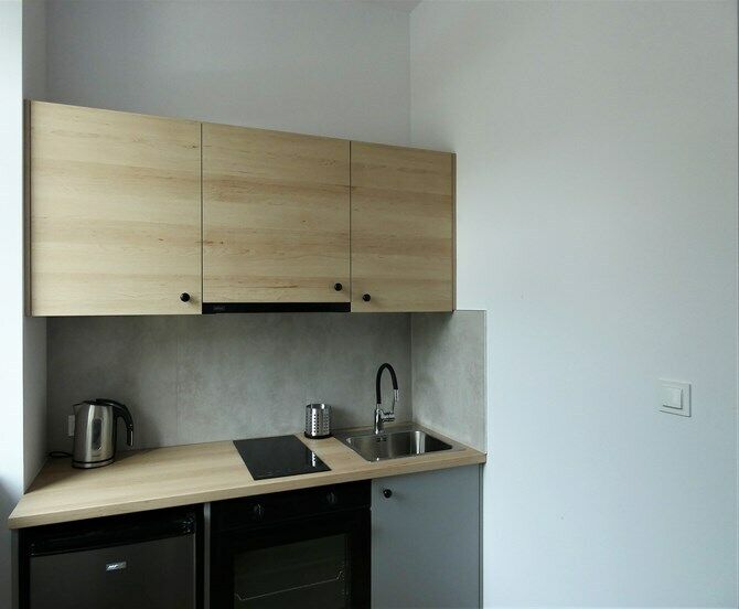 Pokój z aneksem: szafki wiszące i stojące, łóżko, komoda,