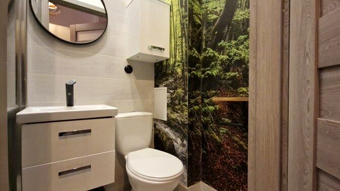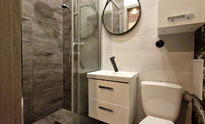 Łazienka z WC: kabina prysznicowa, lustro z umywalką, szafka.