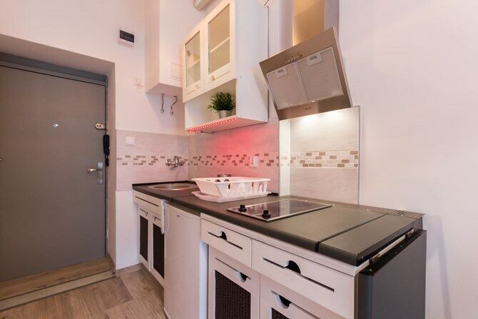 Aneks kuchenny: szafki wiszące i stojące, płyta elektryczna,