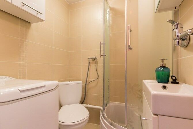 Łazienka: prysznic, WC, umywalka z szafką, pralka.
